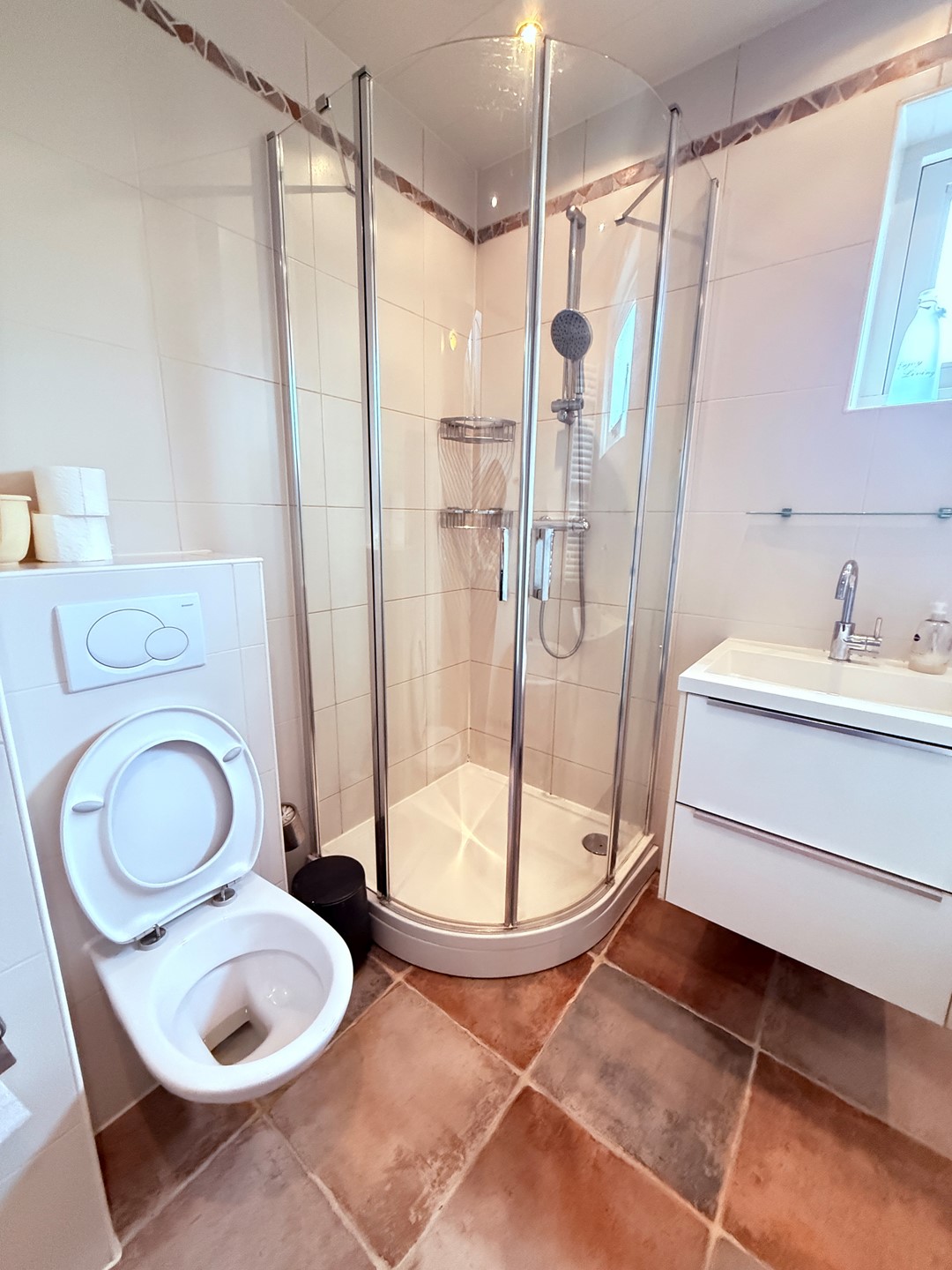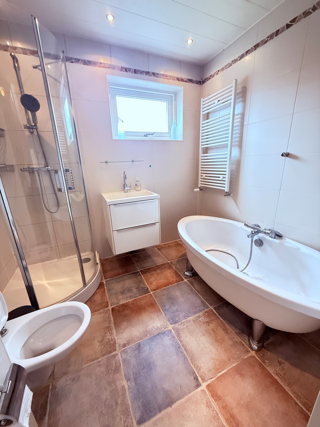 Modern bathroom with walk-in shower, bathtub, toilet, sink, and a window for natural ventilation
