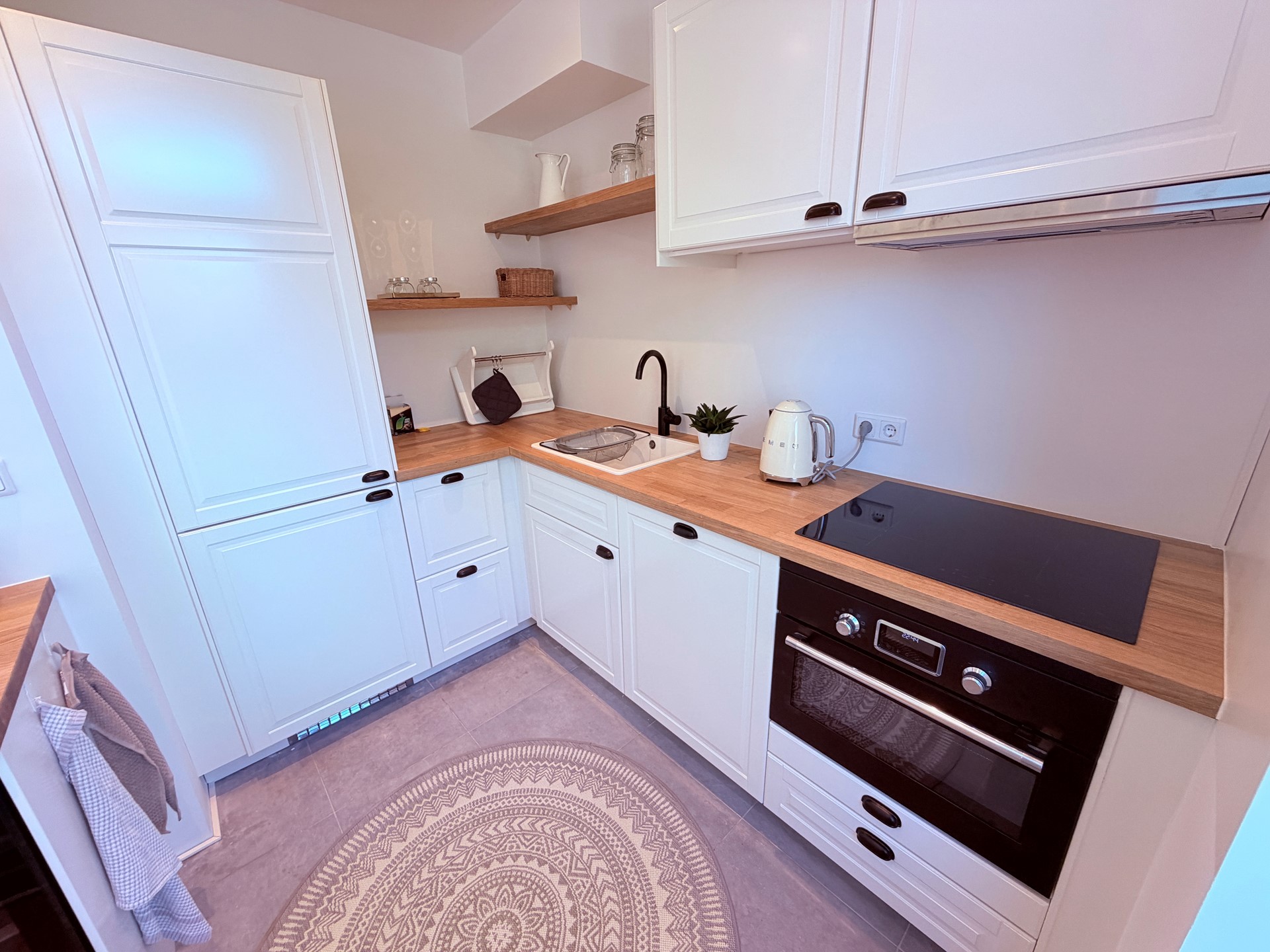 Moderne open keuken met vaatwasser, koelkast, vriezer, gasfornuis, oven en stoomoven