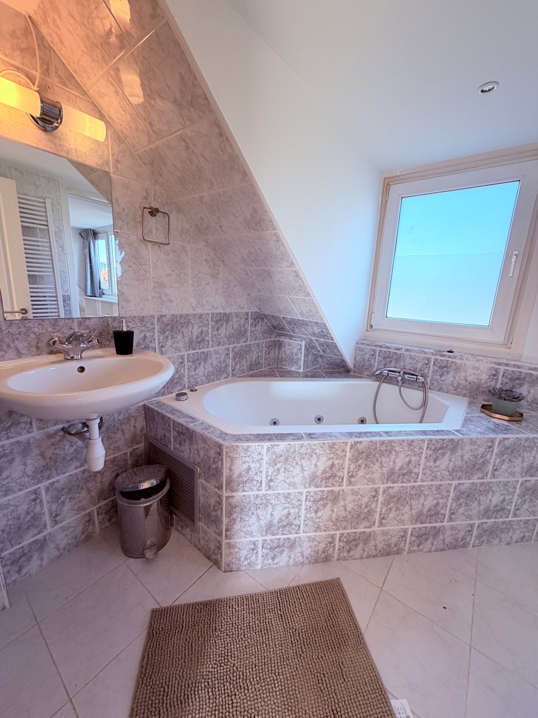 Luxe badkamer met ligbad, aparte douche, wastafel en designradiator