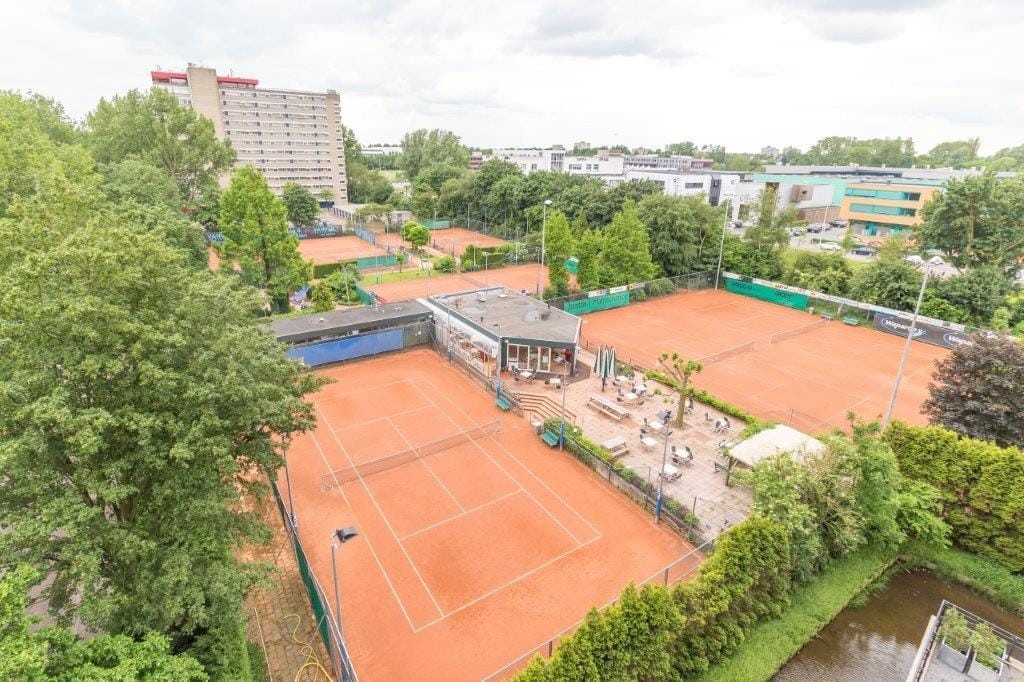 Sunny south-facing balcony (12 m²) with open views over tennis courts and sports fields