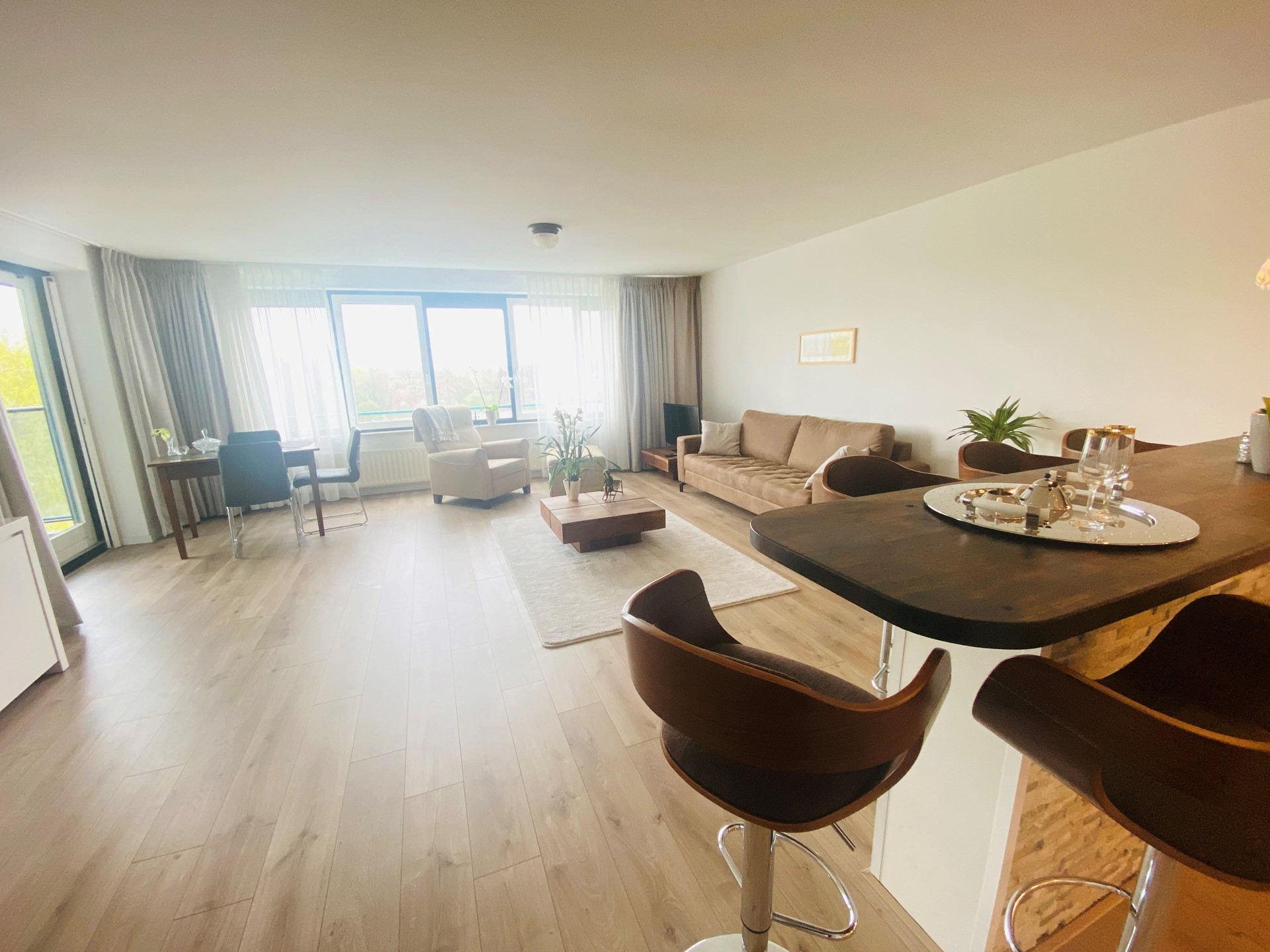 ruime & stijlvol ingerichte woon-/eetkamer met smaakvolle moderne lichte vloer, modern meubilair, toegang tot het ruime balkon gelegen op het zuidoosten;
