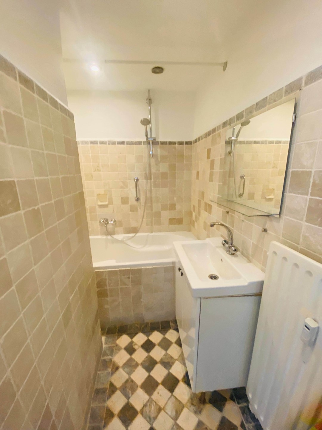 The bathroom features a bathtub with shower, washbasin with cabinet, and radiator. There is a separate toilet and a large storage closet in the hallway.