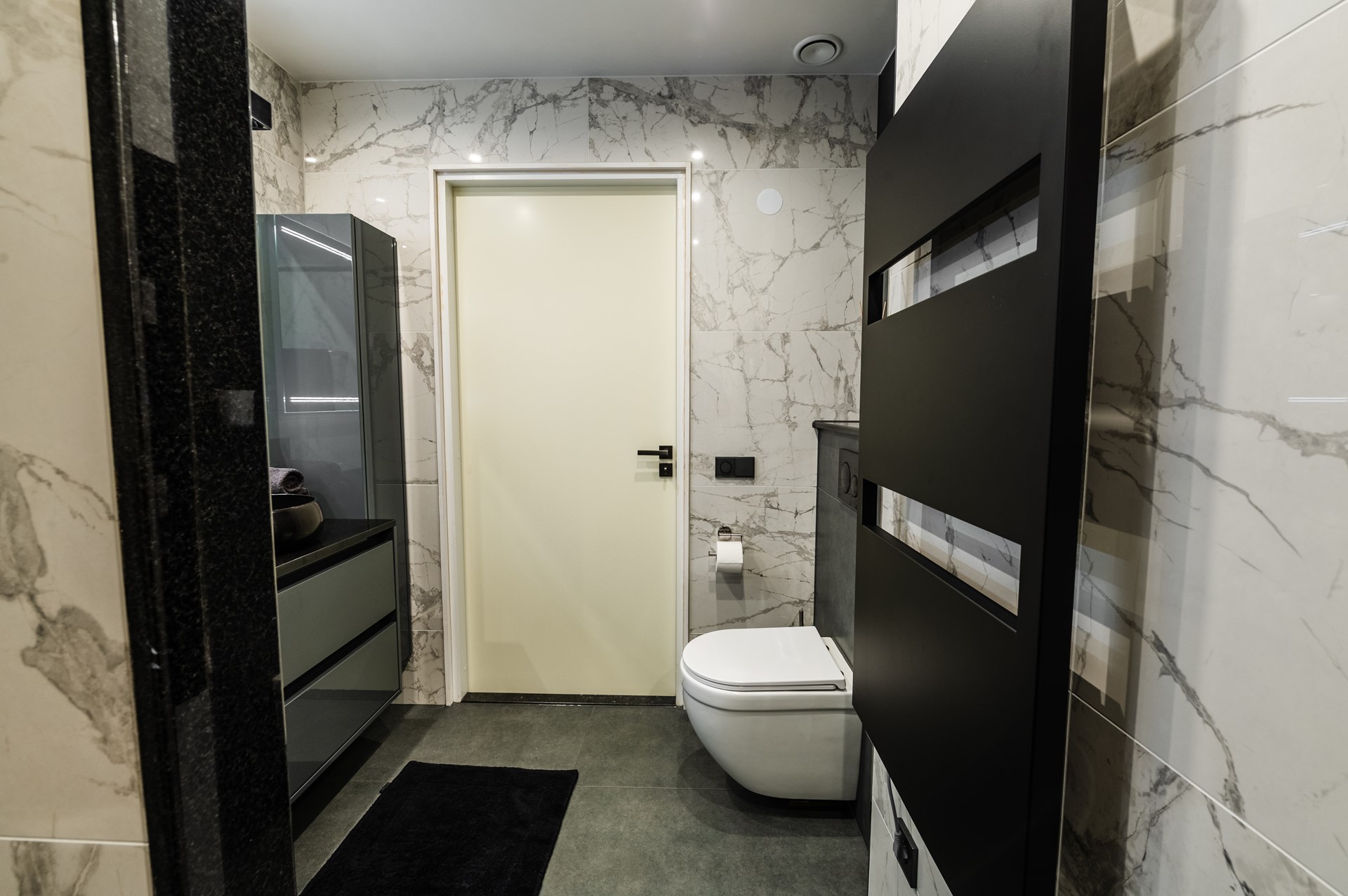 Modern bathroom with bathtub, walk-in shower, double sink, and second toilet