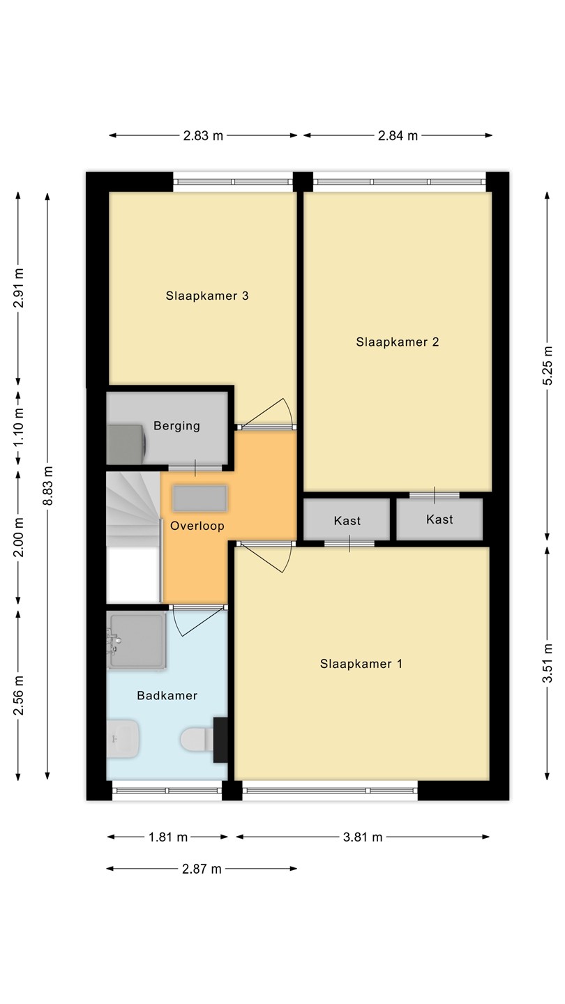 On the first floor, the landing leads to a practical storage and laundry area, as well as the bathroom, which includes a shower cabin, washbasin, second toilet, and a window for natural ventilation. This floor also provides three comfortable bedrooms: a master bedroom with a built-in wardrobe, a second bedroom with a double bed and wardrobe, and a third bedroom furnished with two single beds.